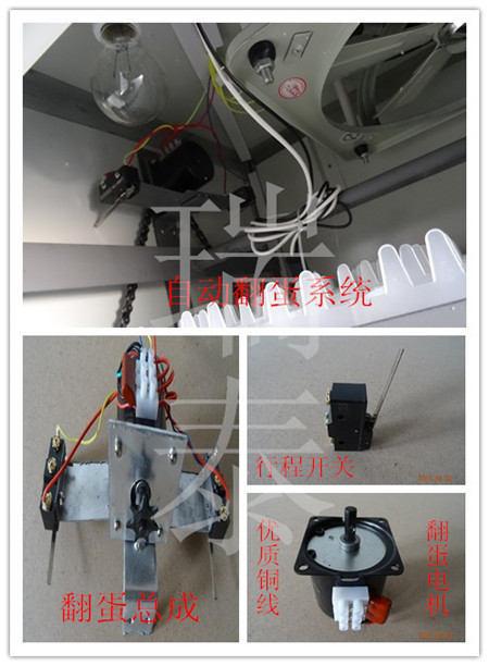 4、翻蛋系統(tǒng):由減速電機、齒輪和鏈條組成.翻蛋周期出廠設置為每2小時一次,翻蛋角度可自由調整.